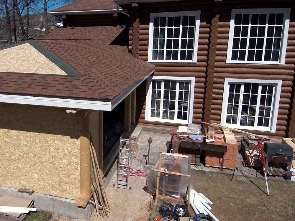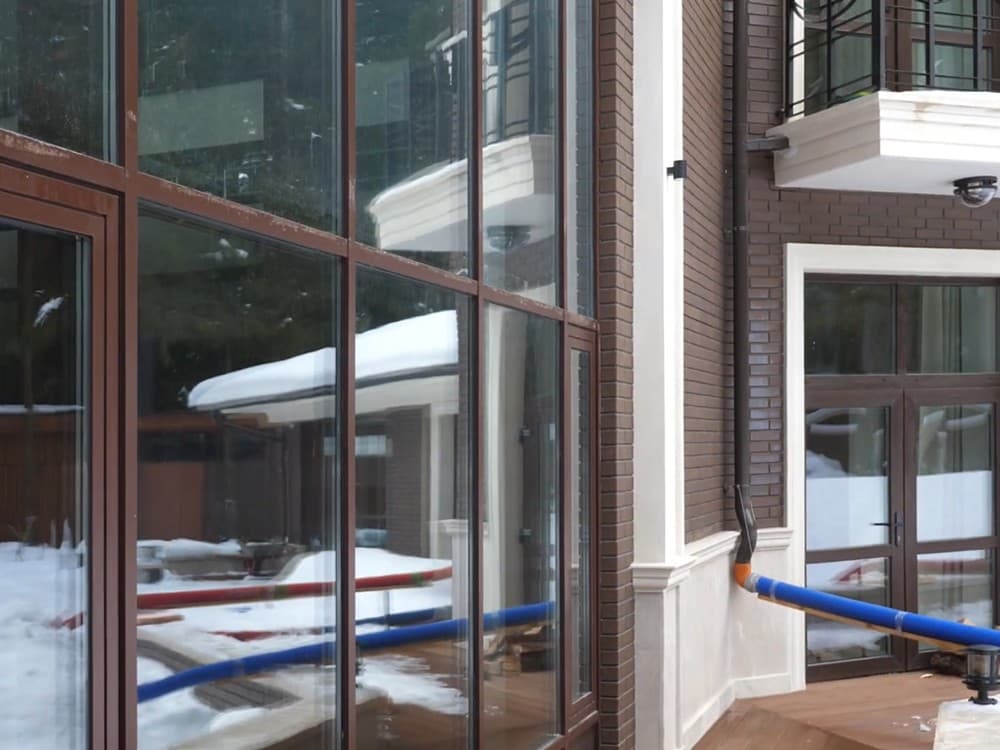 Выполненные работы: Установлена портально-сдвижная дверь, Профильная система REHAU Thermo, Ламинация изделий под дерево, Фурнитура Siegenia, Стеклопакет 40 мм с i-стеклом