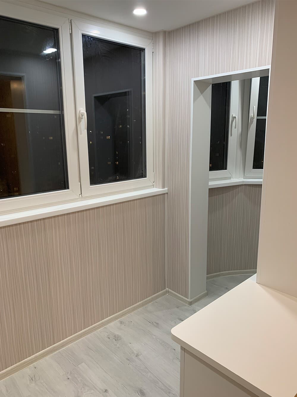 Выполненные работы: Демонтаж старых окон, Остекление лоджии профилем REHAU Intelio 80, Утепление и отделка балкона, Проводка электрики и теплого пола, Установка шкафов