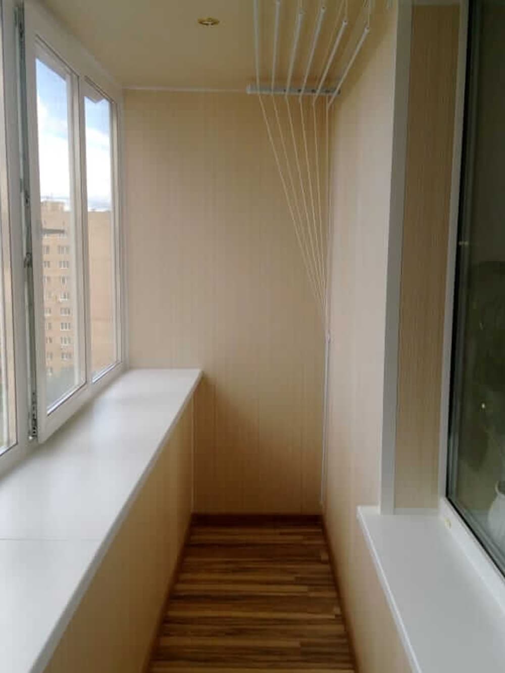Выполненные работы: Демонтаж старых конструкций, Остекление балкона профилем Provedal C640, Отделка балкона и установка сушки для белья, Вывоз мусора