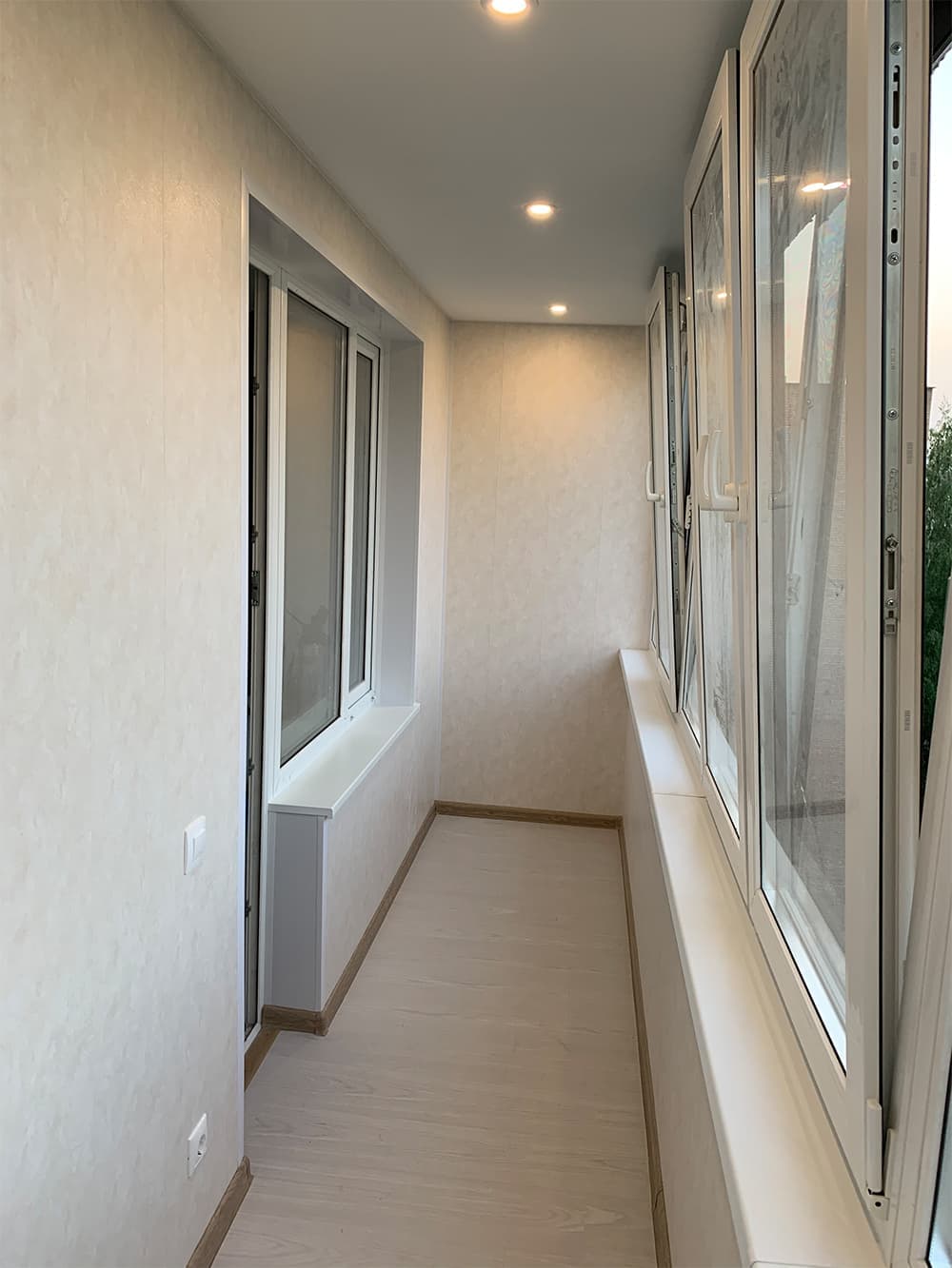 Выполненные работы: Остекление лоджии профилем REHAU Grazio, Утепление и отделка ламинированными панелями, Проводка электрики и установка светильников, Вывоз мусора