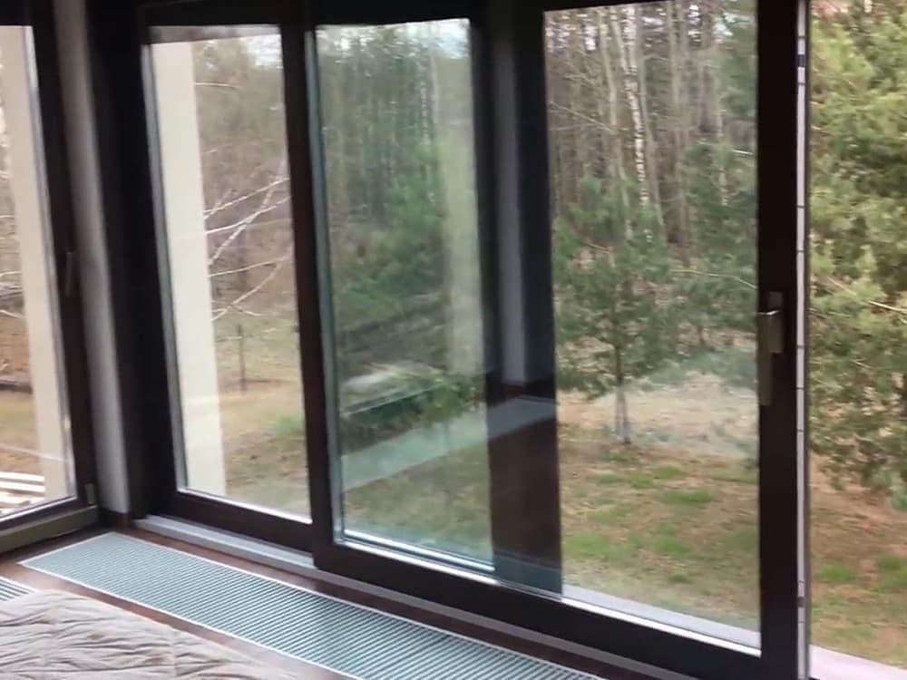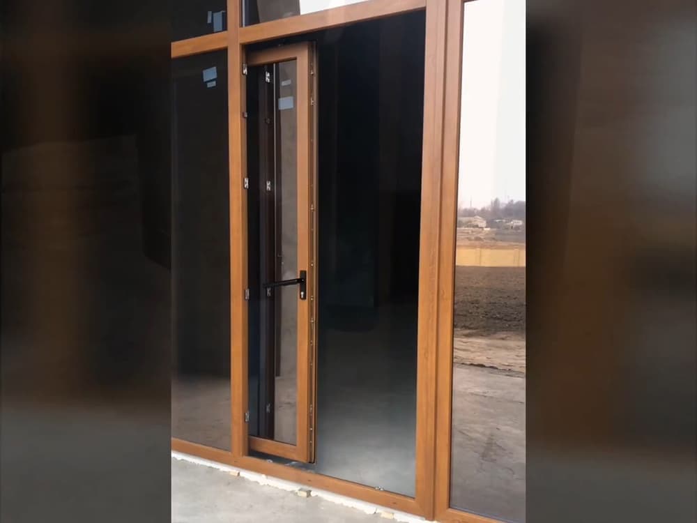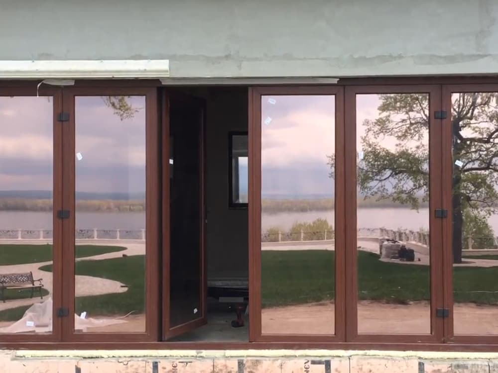 Выполненные работы: Установлена портально-сдвижная дверь, Профильная система REHAU Thermo, Ламинация изделий под дерево, Фурнитура Siegenia, Стеклопакет 40 мм с i-стеклом